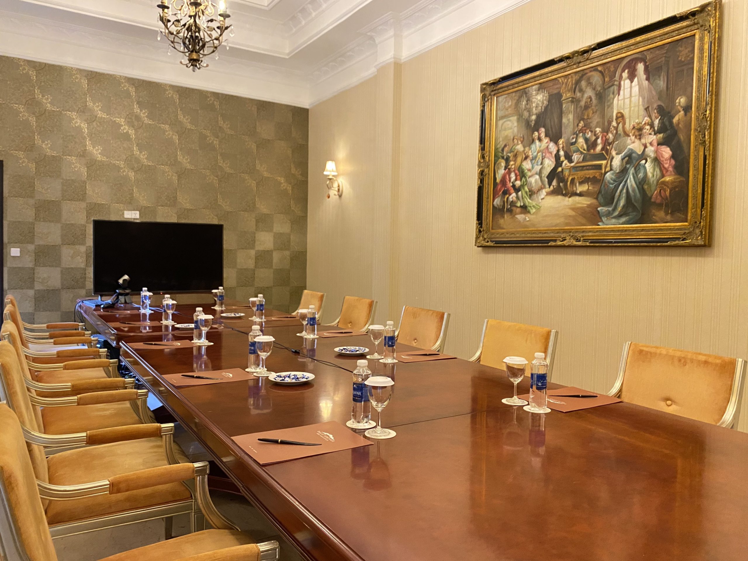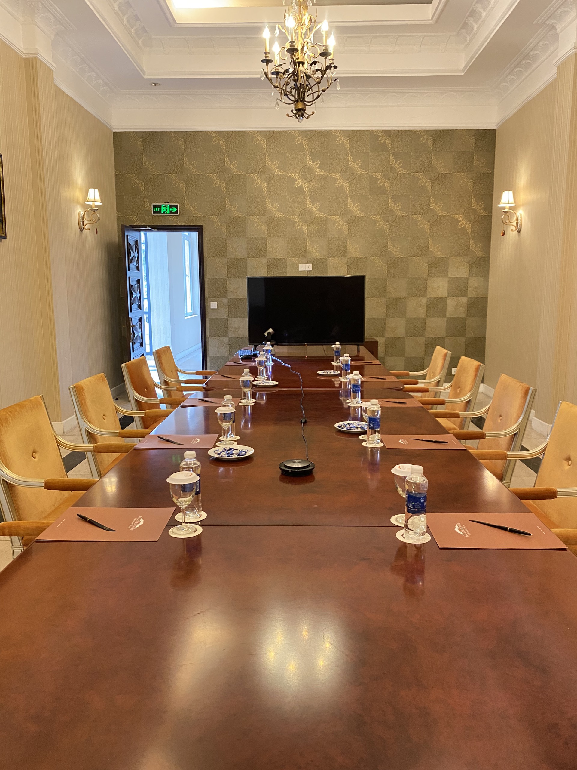 The VIP meeting room boasts timeless elegance with its exquisite marble flooring and high-end conference equipment. This private, tranquil space is designed specifically for high-level meetings, accommodating up to 15 guests, where every important decision is made with meticulous attention to detail and sophistication.